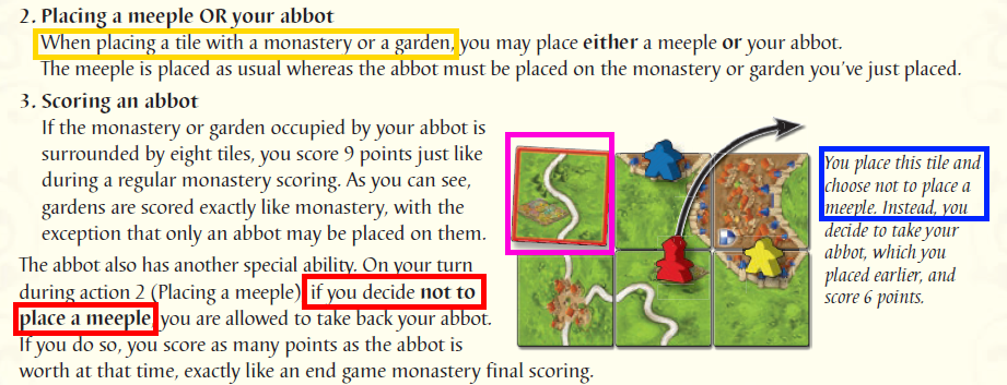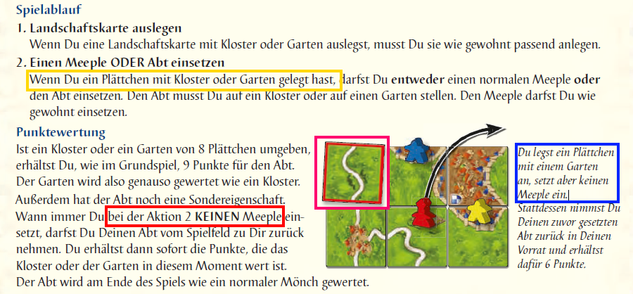 Hier die erste Regel zum Abt: Erklärung: Man legt ein Kloster oder Garten an und setzt KEINEN Meeple auf dieses gezogene Plättchen ein, dann darf man den Abt wieder zurücknehmen. (Rechts im Beispiel steht es richtig beschrieben). Beispielbild ist verkehrt.