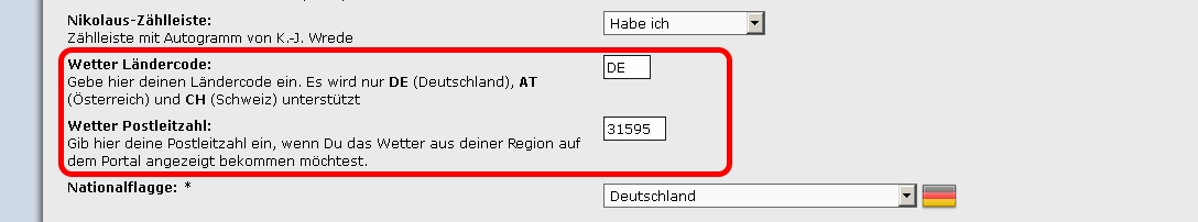 Wenn ihr die ausfüllt, wird euch im Portal das jeweilige Wetter angezeigt. Falls ihr nichts eintragt, wird das Wetter Steyerberg (mein Heimatort) angezeigt.