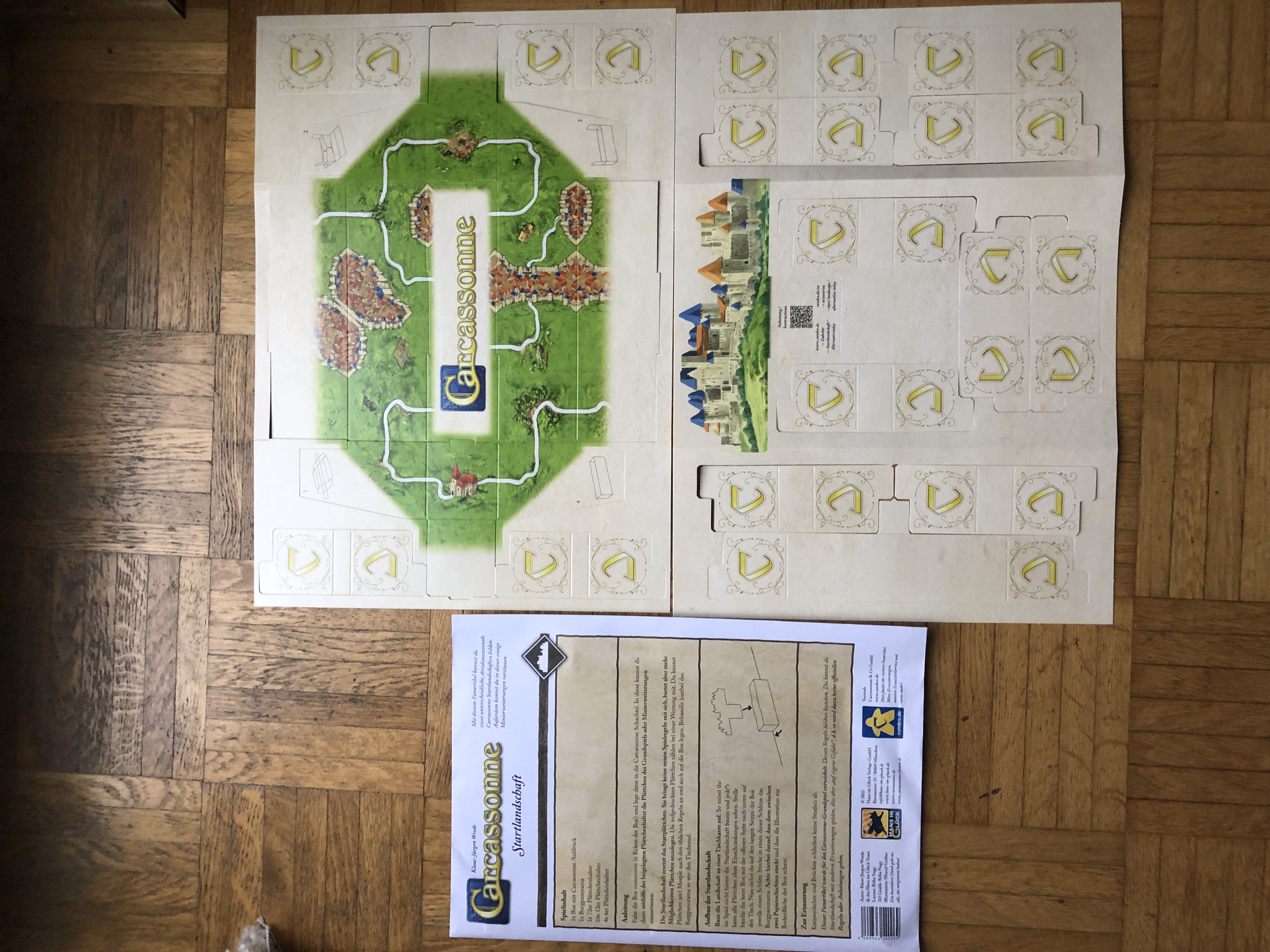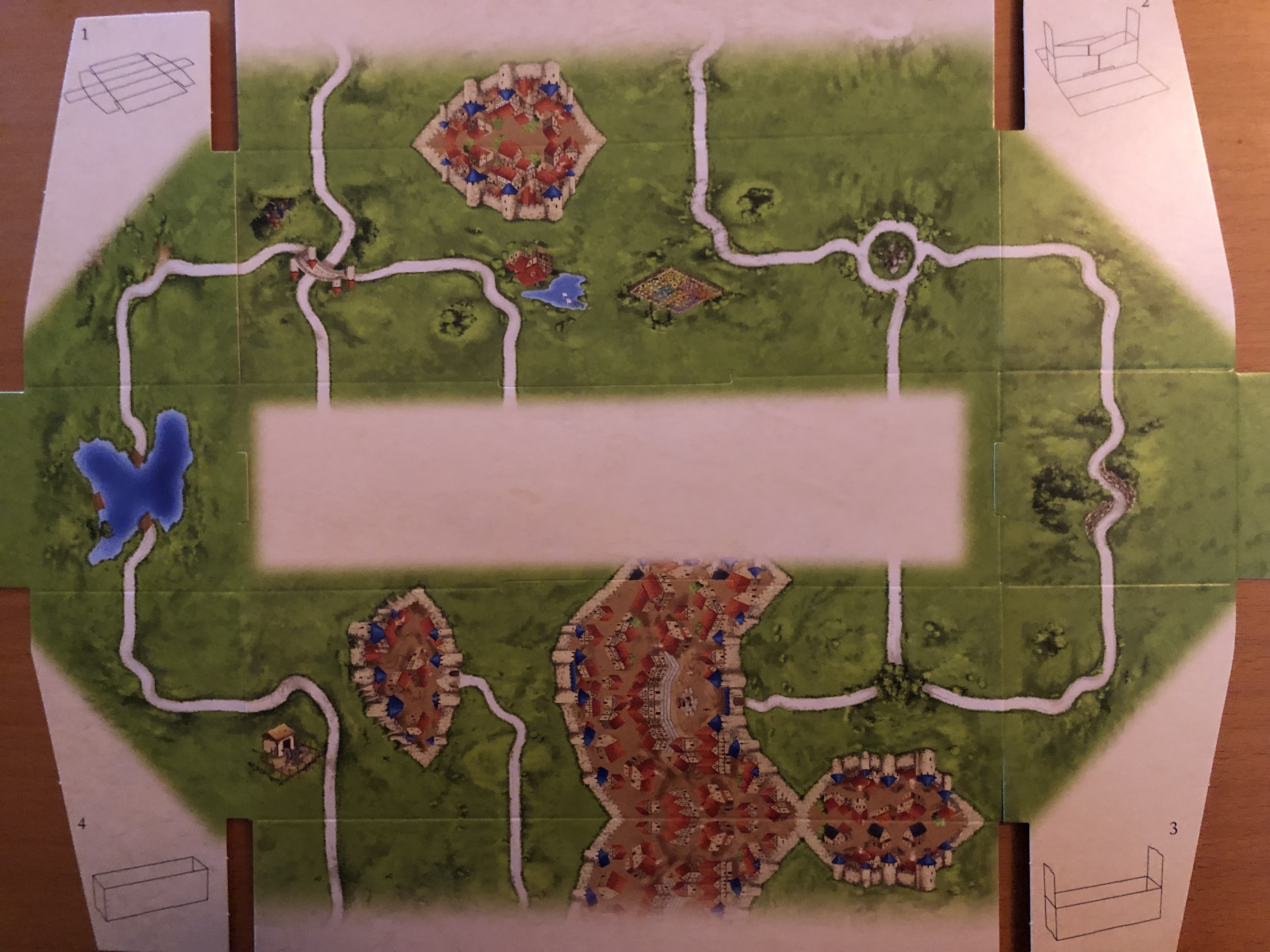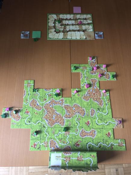 unsere Hausregel: Tischkante beendet Bauwerke nicht, die Stadt Carcassonne oben auf dem Inlay schon (wie bei Maps)