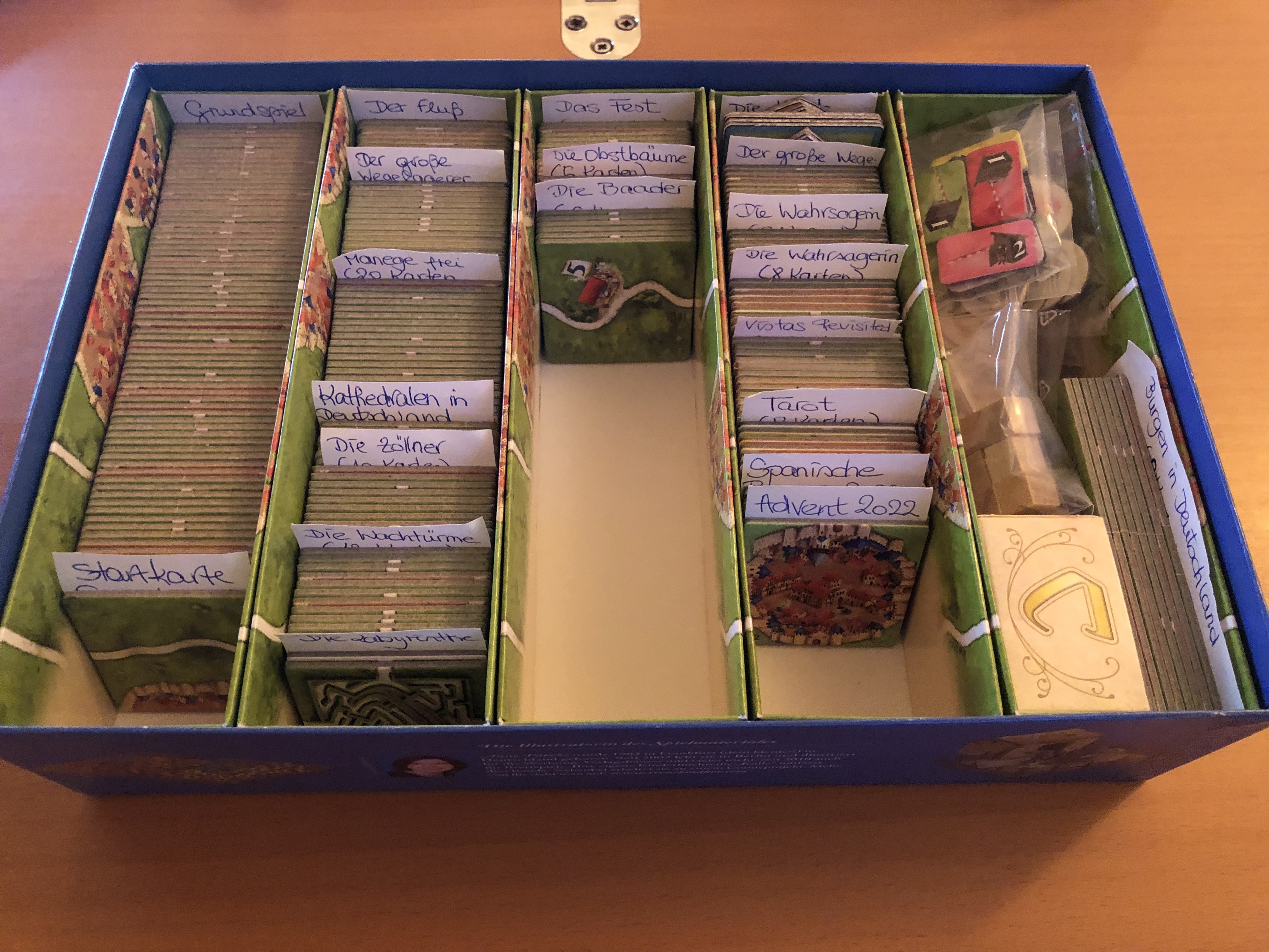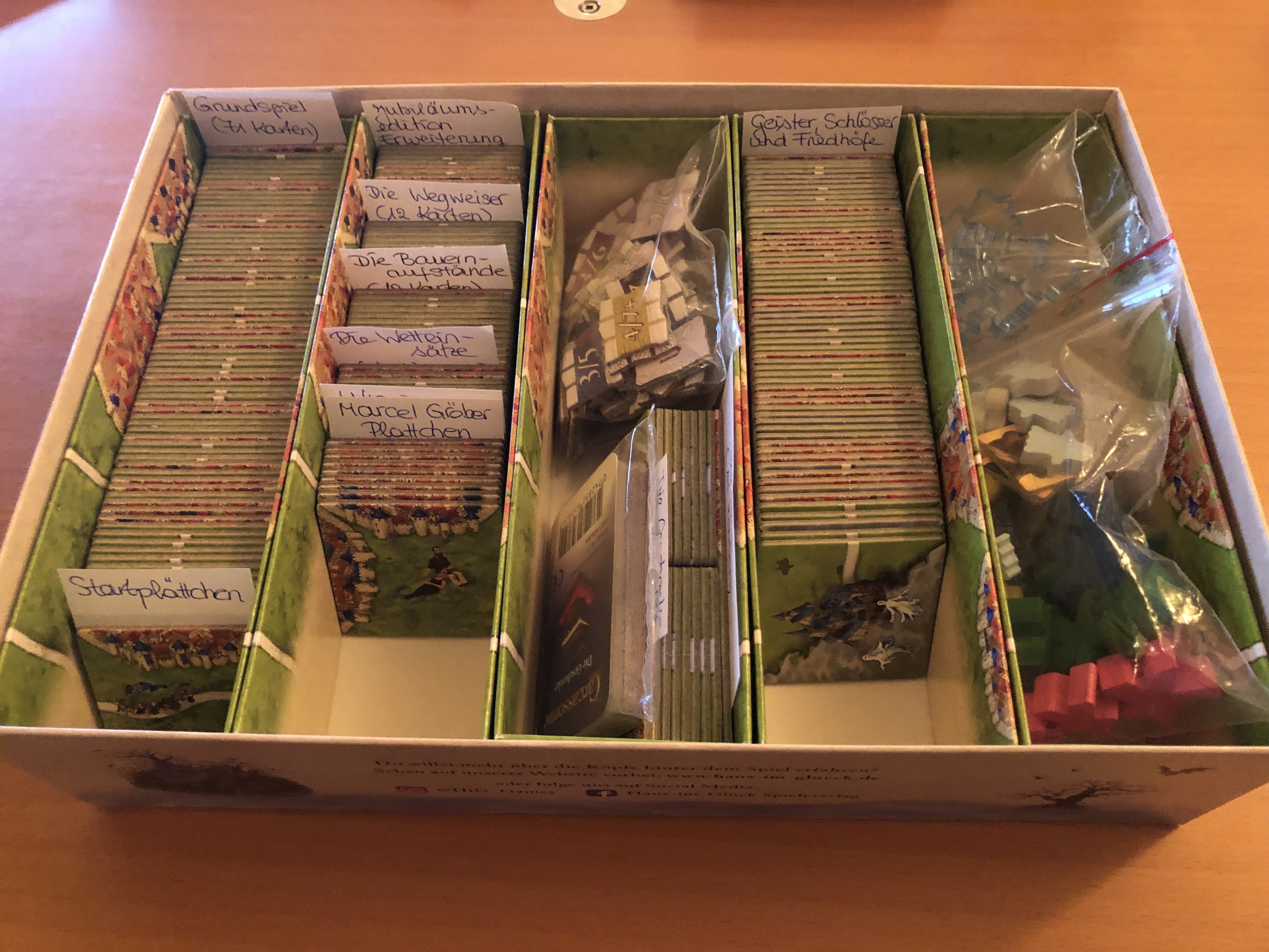 Plättchen mit "sleeves" (Plättchenschutz) passen auch in die Inlays: hier unser Spiel: Es hat Spaß gemacht,