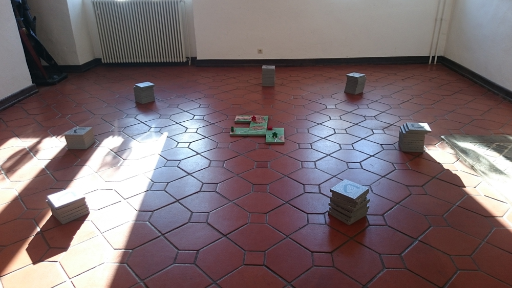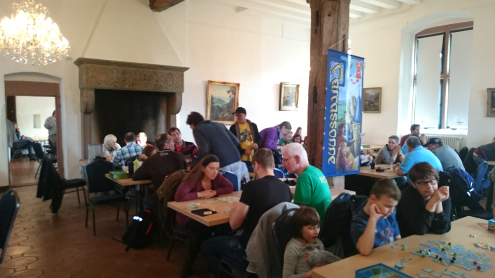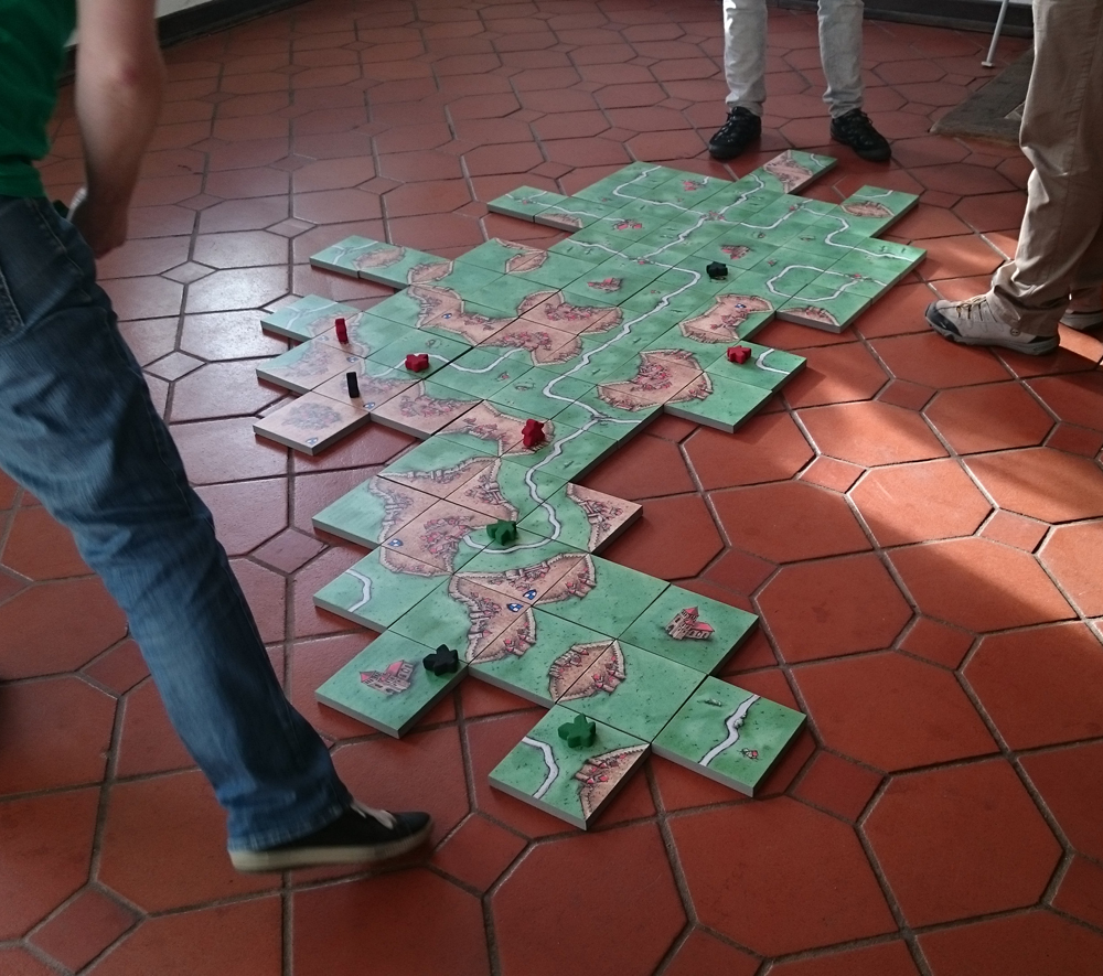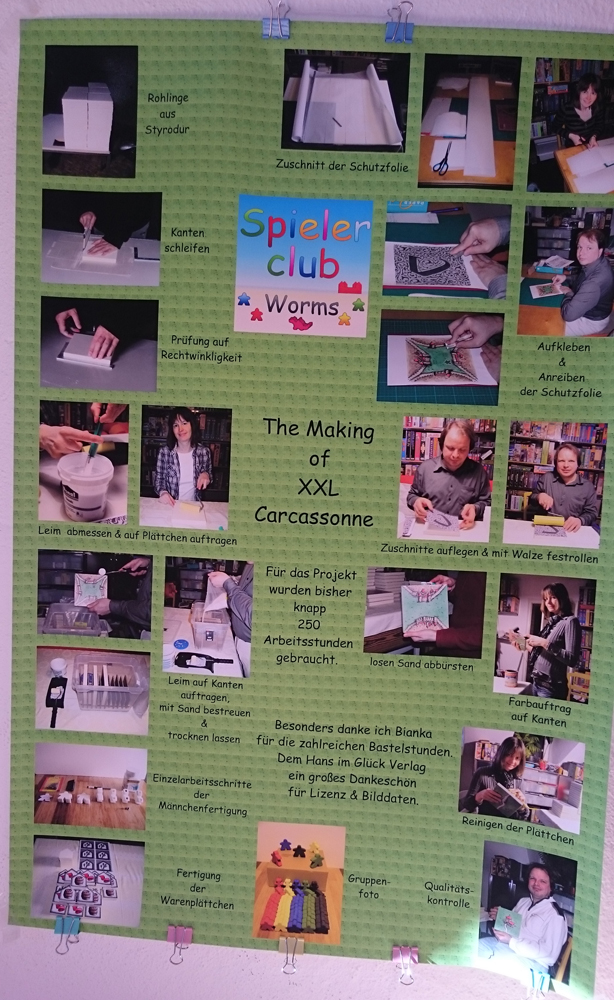 Ich betrat die Burg und war direkt überwältigt von einem outdoor-XXL-Carcassonne, welches im ersten Raum aufgebaut war: Die Landschaftskarten haben eine Kantenlänge von geschätzt 20 cm An der Wand hing ein Plakat, auf dem die Herstellung des XXL-Carcassonne beschrieben wird: Das Spiel wurde von Falk Ruckert, vom Spielerclub Worms gebastelt. Für Rückfragen steht Falk gerne zur Verfügung unter spielerclub@web.de