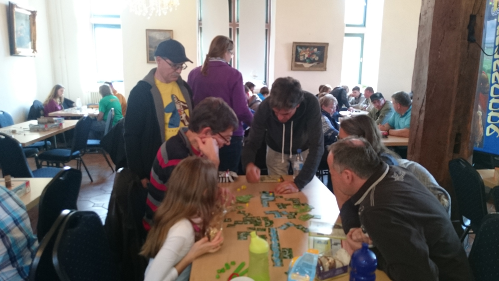 Im Laufe des Tages habe ich mit Benny, Holger und Käpt'n Konrad, unter Anleitung von Udo, den Prototyp der 10. großen Erweiterung, die im Frühjahr 2017 erscheint und das Thema Zirkus hat, gespielt: Die Erweiterung macht einen sehr guten Eindruck und ich freue mich schon auf sie
