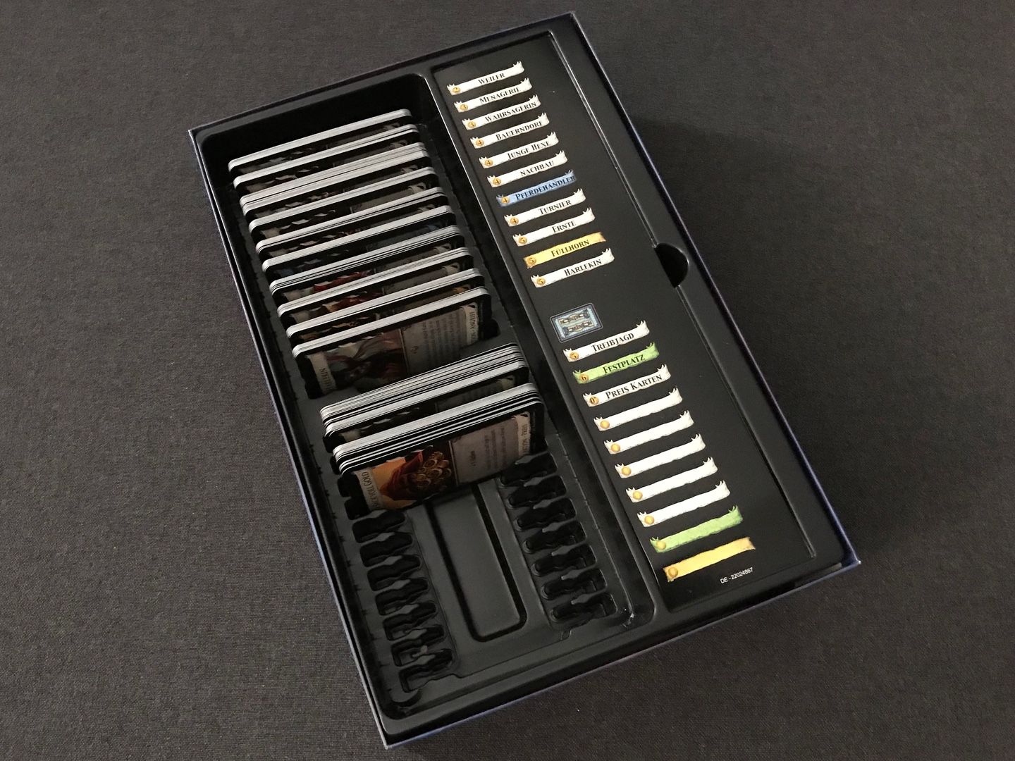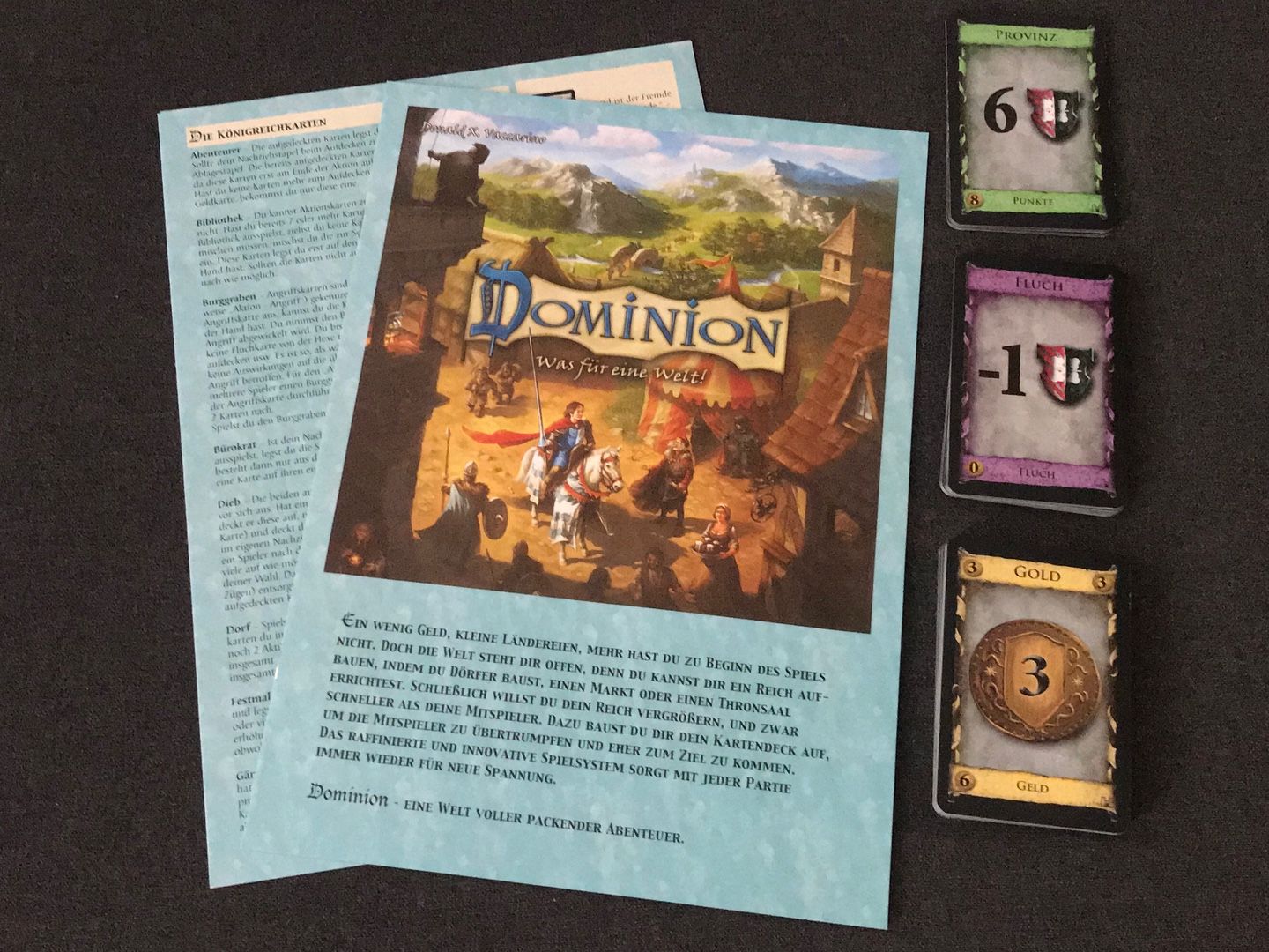 Als „Trostpflaster“ das 2 Karten fehlen, lege ich genug Basiskarten mit rein so dass man das Spiel auch zu 5. oder 6. spielen kann. Sprich: Es sind zusätzlich 30 Goldkarten, 20 Fluchkarten und 6 Provinzkarten mit in der Box.