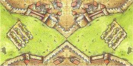 Zweimal genau der rechte Stadtteil (spiegelbildlich) funktioniert nicht, weil dann eine Lücke zwischen linkem und rechtem Stadtteil ist. Wenn man den linken vergrößert hat man ziemlich das Original, außer dass hier noch der Hügel mit drauf ist.