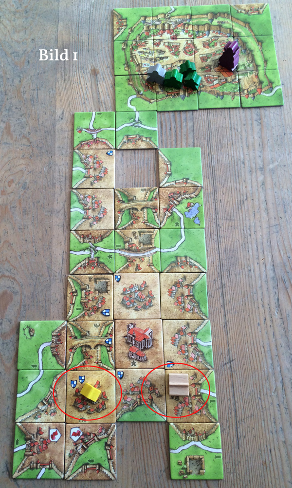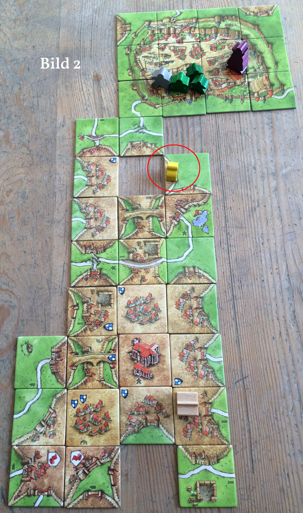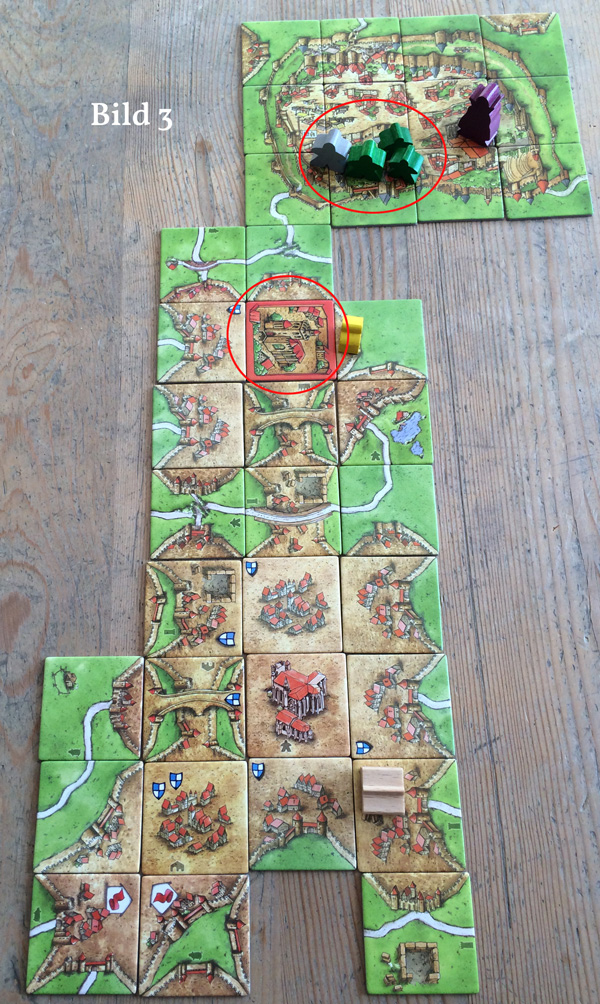 Die Tatsache, dass Spieler 1 mit dem Legen seiner Abtei keine Punkte bekommt, wäre nur dann von Bedeutung, wenn er weitere GFM nach Carcassonne setzen wollte. Nach Fertigstellung eines Gebiets dürfen vor der Wertung immer eine beliebige Anzahl GFM aus dem entsprechenden Stadtviertel auf besagtes Gebiet gesetzt werden. Also darf Spieler eins die große Stadt ganz klar besetzen und die Punkte abgreifen.