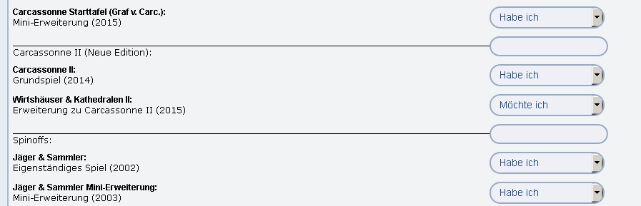 Schicksalsrad sollte m.E. unter Carcassonne 1 stehen, mit dem Vermerk "mit Zusatzregeln" oder so.maik63de hat geschrieben: Einwenig habe ich mich bei der Jubiläumsedition und dem Schicksalsrad schwer getan. Sind das eventuell Sondereditionen???