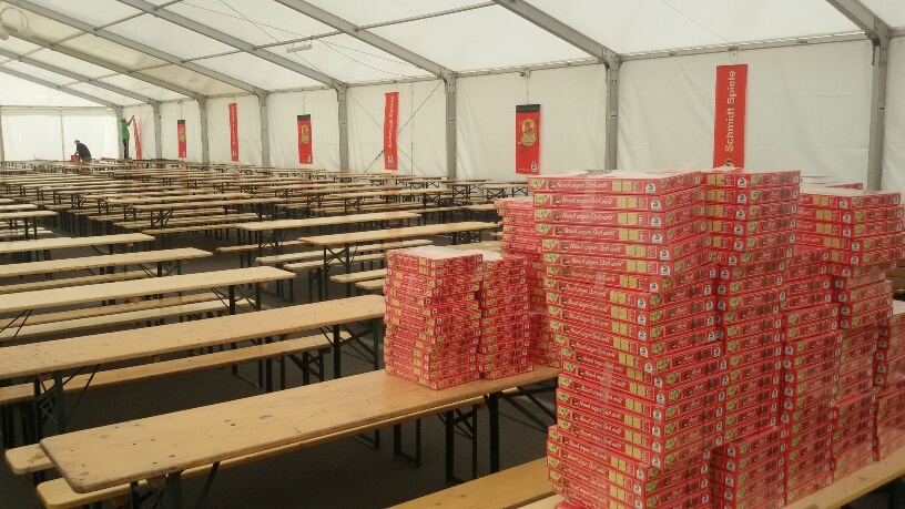Als erstes haben Udo und ich alle Kisten aus dem Auto ins Zelt geschleppt und in der Nähe des Einganges abgestellt. In einer Ecke wird daraus u. A. der gewohnte "Carcassonne on Tour"-Stand entstehen. Was uns noch fehlt, sind die Spiele, Preise und das Werbematerial für den Weltrekordversuch. Das alles lagert in einer Garage der Stadtverwaltung auf zwei riesigen Paletten. Das gilt es nun abzuholen. Dort angekommen, müssen wir erstmal feststellen, dass alles verschwunden ist. Eigentlich wäre das der erste Grund, etwas zapplig zu werden. Aber wie man uns berichtet, hatte das Organisationsbüro bereits ein paar Leute losgeschickt, um uns das Material zum Zelt zu bringen.