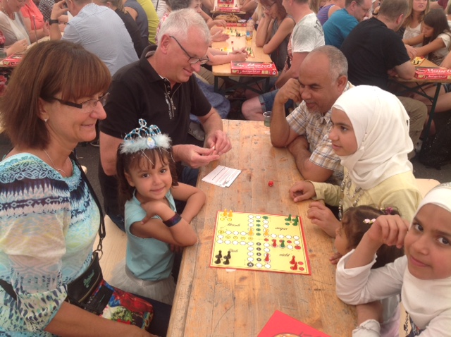 Eine syrische Flüchtlingsfamilie mit ihren Kindern, traditionell entsprechend ihrer Herkunft gekleidet, begleitet von ihrer Patenfamilie, hatten ebenfalls mitgespielt. Sie haben das erste Mal "Mensch ärgere dich nicht" gespielt und waren total begeistert. Annett hat ihnen am Ende der Veranstaltung ein "Mensch ärgere dich nicht"-Spiel geschenkt.