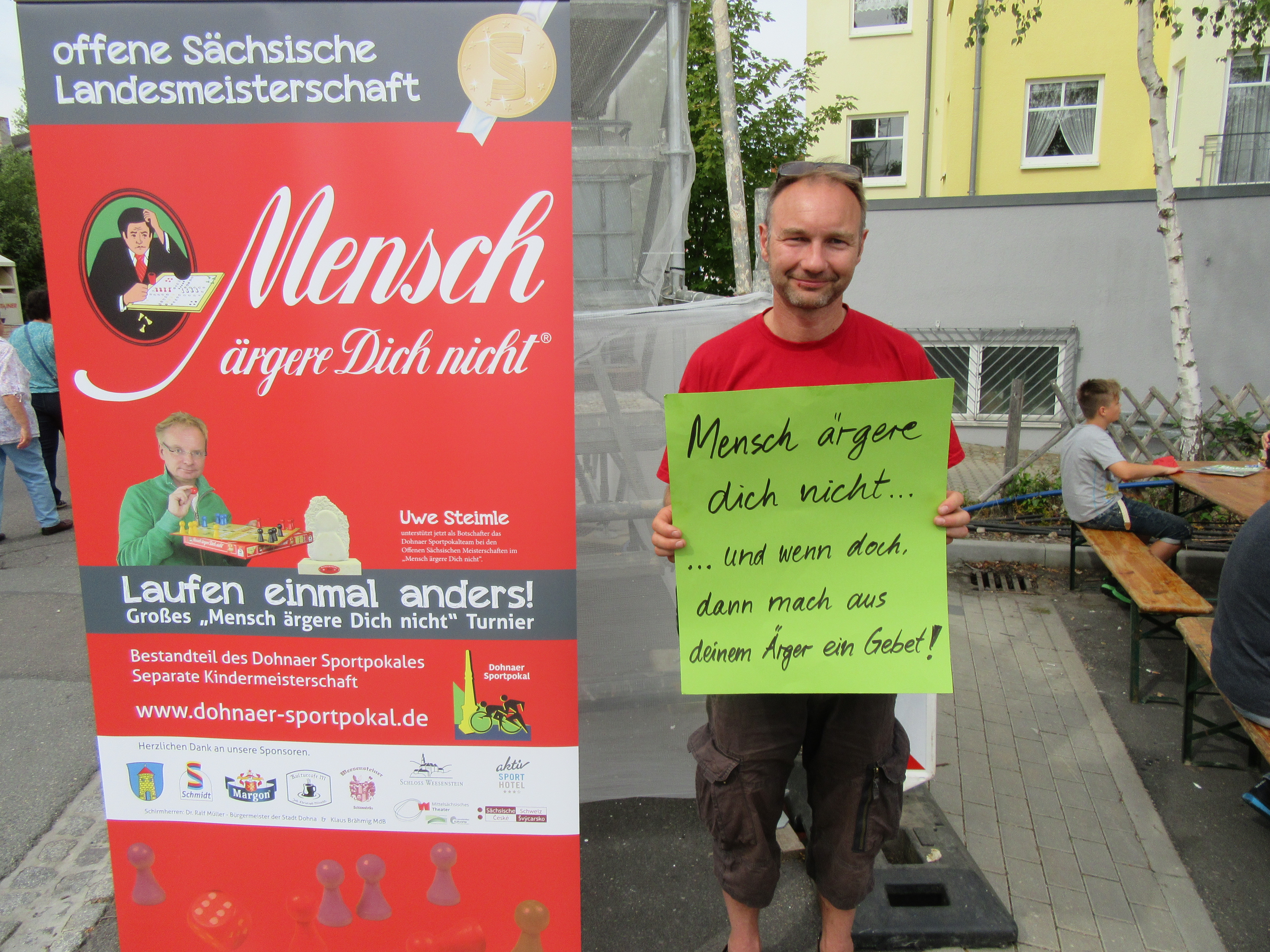 Ich habe noch einen kleinen Nachtrag. Am Rande der Veranstaltung wurde auch für die Sächsische Landesmeisterschaft im "Mensch ärgere Dich nicht" geworben. Ein junger Mann, der dies für seine Botschaft ausnutzte, hatte mich gebeten, dieses Foto zu machen, nun hat er es mir geschickt und ich möchte es Euch nicht vorenthalten: