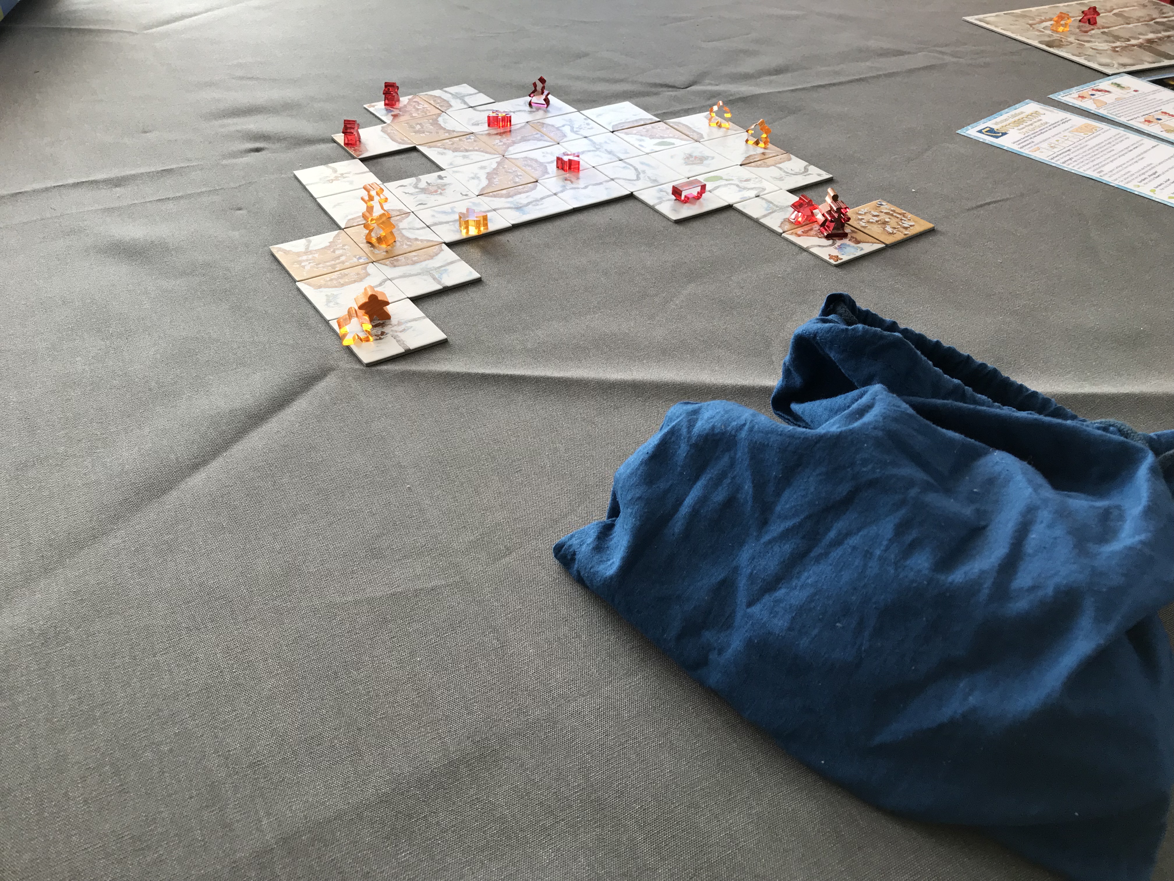 BTW: Ich musste hier Platz- und Tischmässig etwas improvisieren und habe als Spieltisch 2 Tapeziertische zusammengeschoben. Da diese u.a. einen kleinen leicht erhobenen Rand haben, habe ich meine vorhandene Spielmatte ausgebreitet und... Naja, ich hab sie eigentlich für „Doom“ gekauft weswegen sie das Motiv der Marsoberfläche hat. Dies rief bei uns beiden den Gedanken hervor dass wir gerade Terraforming betreiben und den Mars kolonialisieren. Zeitlich nicht unbedingt die Carcassonne-Thematik, aber egal. :