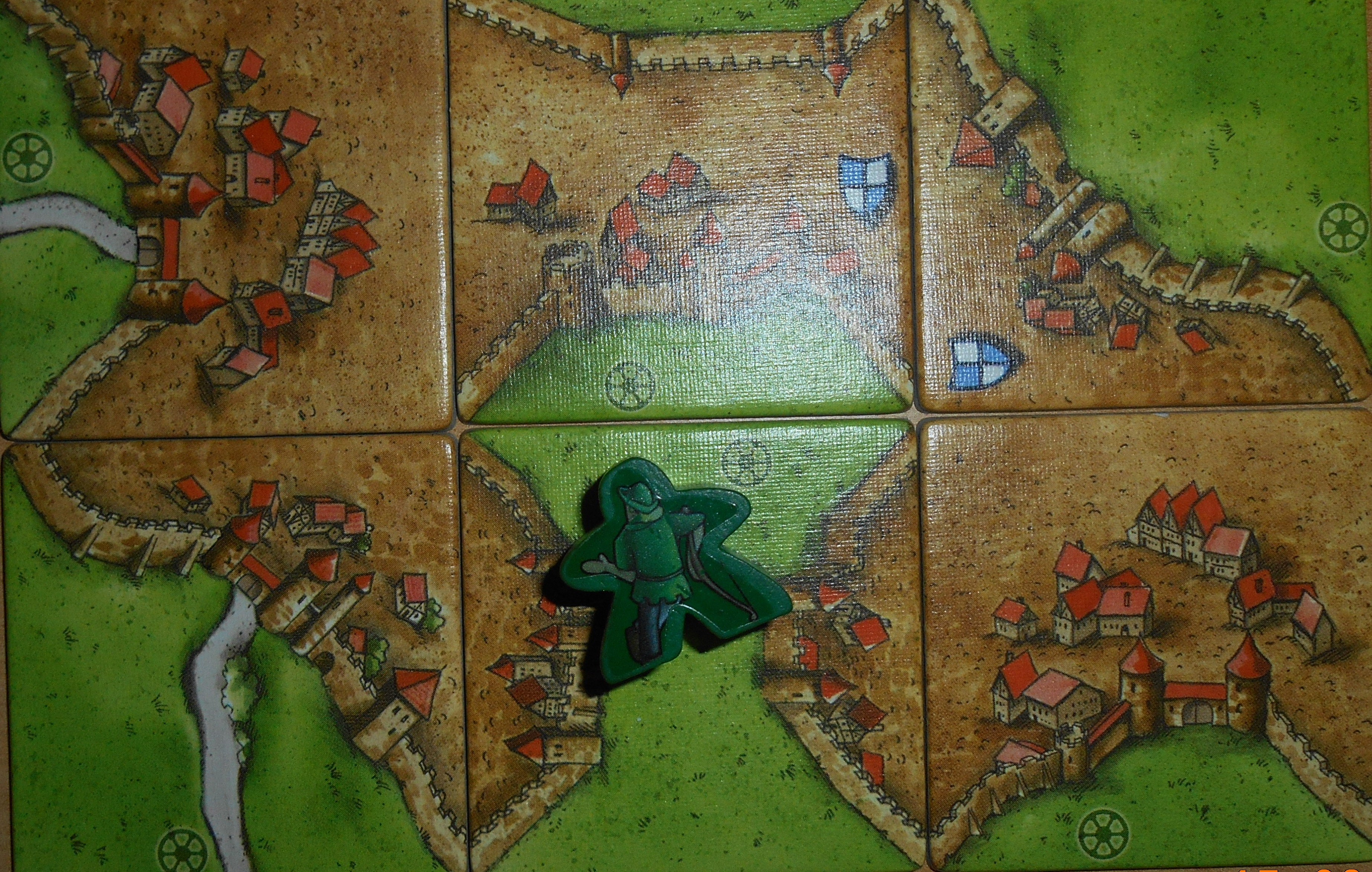 Der blaue Bauer hätte zwar beim Anlegen z.B. der Quelle auf die Wiese gelegt werden können, aber nicht auf die Grafenstadt. Der Gelbe Bauer darf nicht gelegt werden, da sich bereits ein Bauer (wenn auch falsch) auf der Wiese befindet. (Fehler 7 und 8)