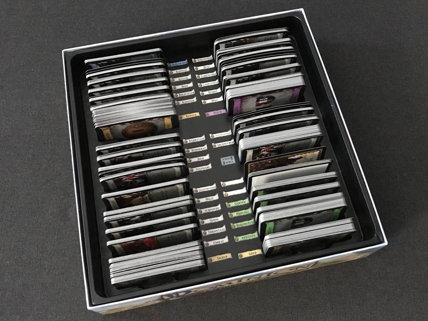 Als „Trostpflaster“ das 2 Karten fehlen, lege ich genug Basiskarten mit rein so dass man das Spiel auch zu 5. oder 6. spielen kann. Sprich: Es sind zusätzlich 30 Goldkarten, 20 Fluchkarten und 6 Provinzkarten mit in der Box.