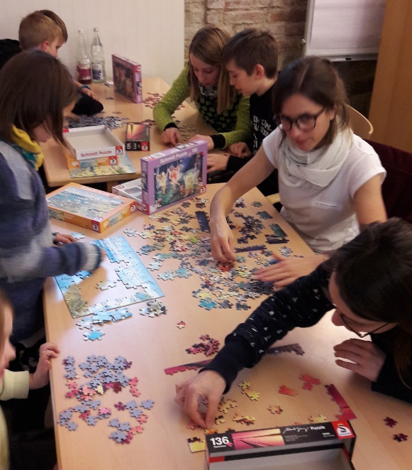 Auch eine kleine Puzzle-Aktion versammelte nicht nur die Kinder an den Tischen, auch die Mütter waren sehr konzentriert bei der Sache: