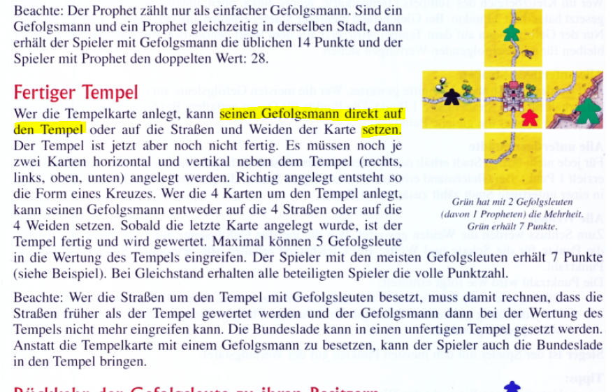 Wer die Tempelkarte anlegt, kann seinen Gefolgsmann direkt auf den Tempel oder auf die Straßen und Weiden der Karte setzen. Der Temple ist jetzt aber noch nicht fertig. Es müssen noch je zwei Karten horizontal und vertikal neben dem Tempel (rechts, links, oben, unten) angelegt werden. Richtig angelegt entsteht so die Form eines Kreuzes. Wer die 4 Karten um den Tempel anlegt, kann seinen Gefolgsmann entweder auf die 4 Straßen oder auf die 4 Weiden setzen. Sobald die letzte Karte angelegt wurde, ist der Tempel fertig und wird gewertet. Maximal können 5 Gefolgsleute in die Wertung des Temples eingreifen. Der Spieler mit den meisten Gefolgsleuten erhält 7 Punkte (siehe Beispiel). Bei Gleichstand erhalten alle beteiligten Spieler die volle Punktzahl.