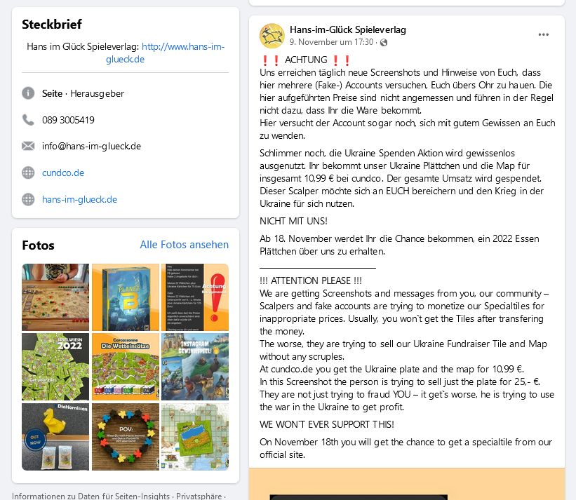 Schlimmer noch, die Ukraine Spenden Aktion wird gewissenlos ausgenutzt. Ihr bekommt unser Ukraine Plättchen und die Map für insgesamt 10,99 € bei cundco. Der gesamte Umsatz wird gespendet. Dieser Scalper möchte sich an EUCH bereichern und den Krieg in der Ukraine für sich nutzen.