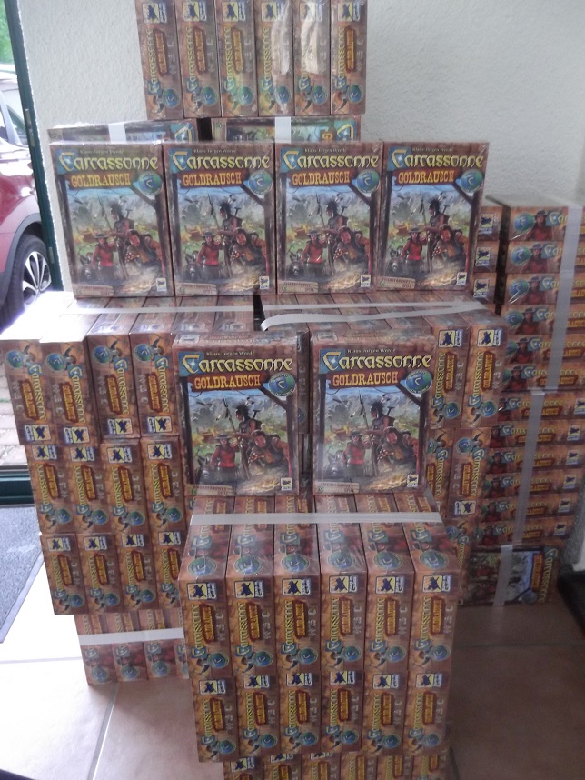 Sie sind da! Die ersten 200 Carcassonne Goldrausch Spiele, frisch aus der Produktion.