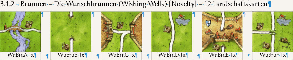 Eigentlich wollte ich mich zu dieser Liste nicht mehr äußern, aber die ganzen Nummerierungen machen das Ganze doch nur hoffnungslos unübersichtlich. Für den wirklich superseltenen Fall, dass man mal Bezug auf eine Landschaftskarte benötigt, erreicht man das genausogut über die Angabe der Position (also Zeile und Spalte). Aber für derartige Ausnahmen treibt man doch nicht so einen Aufwand, der in 99,9% aller Fälle völlig überflüssig ist. Es ist eher angeraten, den Platz für Bezeichnungen von Zusätzen oder Sonderkarten wie beispielsweise für die zusätzliche Karte bei der "Eiskönigin" oder für Bezeichnungen für Spielmaterial freizuhalten.