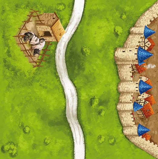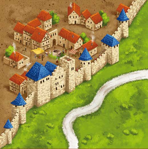 Wir hatten beim Erstellen der Grafiken einige Versuche mit gemischten Türmen, wie es in echt auch ist. -Wobei es beim echten Carcassonne wohl an den verschiedenen Bauepochen liegt- Jedoch sah dies gruselig aus. Die hellen Mauern mit den dunklen Türmen zeigen nun sehr genau an, wo eine Stadt noch offen ist oder wo kein Zugang mehr ist. Ausserdem heben sie sich optimal von der Umgebung ab. Beides sollte neuen Spielern helfen auf einen Blick zu sehen ob nun eine Stadt gewertet wird oder nicht und später auch ob eine Stadt für die Bauern zählt oder nicht.