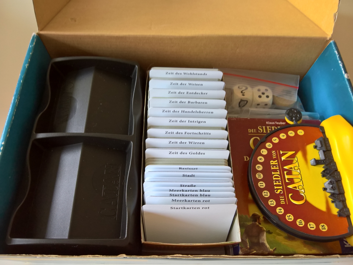 Die leeren Türme liegen oben drauf. Zwar kann man die Landschaftsplättchen auch in selbigen aufbewahren, aber mich hat es genervt, die zum Spielen da rauszuräumen, nicht gewünschte Erweiterungen irgendwo zwischwenzulagern usw. Also habe ich die Pappschachteln geklebt und das eben so gelöst.