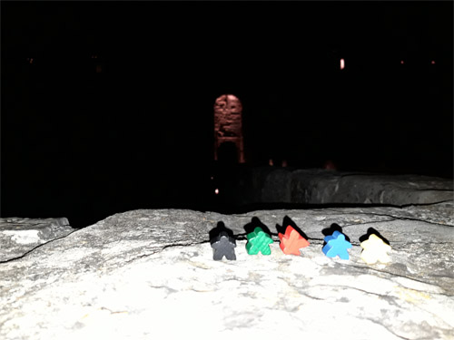 Voller Vorfreude warteten die Meeple schon auf das, was dort gleich passiert. Der rote Meeple war so aufgeregt, dass er sogar einen Handstand machte.