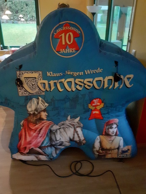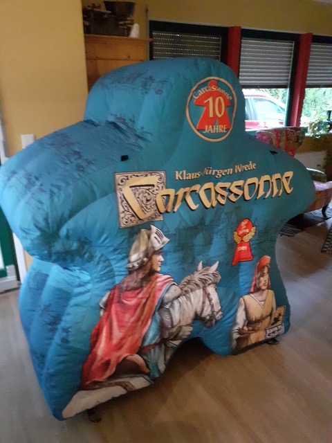 In Sammlerkreisen gab es oft schon Diskussionen über die sogenannten aufblasbaren riesigen Gefolgsmänner, die damals zu Promotionszwecken anlässlich "10 Jahre Carcassonne" in einigen Einzelstücken produziert wurden. Manche Sammler hätten gern ein derartiges Exemplar besessen. Aber erwartungsgemäß standen die nie zum Verkauf. Irgendwie verständlich. Schließlich waren es Einzelanfertigungen. Auch hätte womöglich der hohe Preis abgeschreckt (ca. 2.000 Euro).