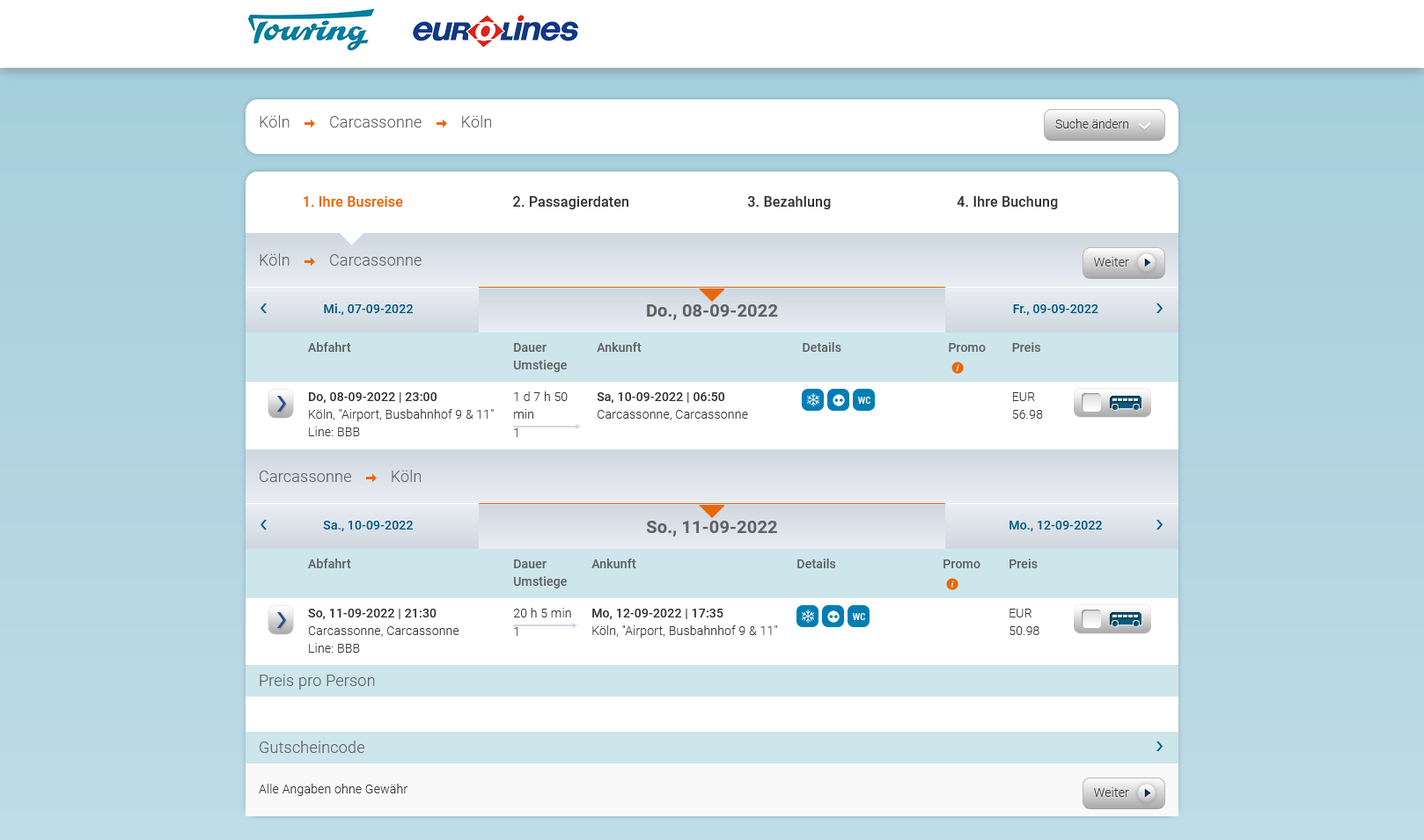 Viele Abfahrtsorte (Dresden, Jena, Berlin) nach Carcassonne (über den Link) scheinen aber nicht oder nicht mehr zu existieren. Dabei bringt die Suche keine Ergebnisse.