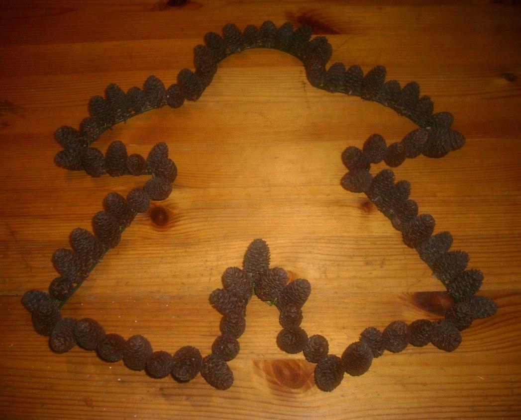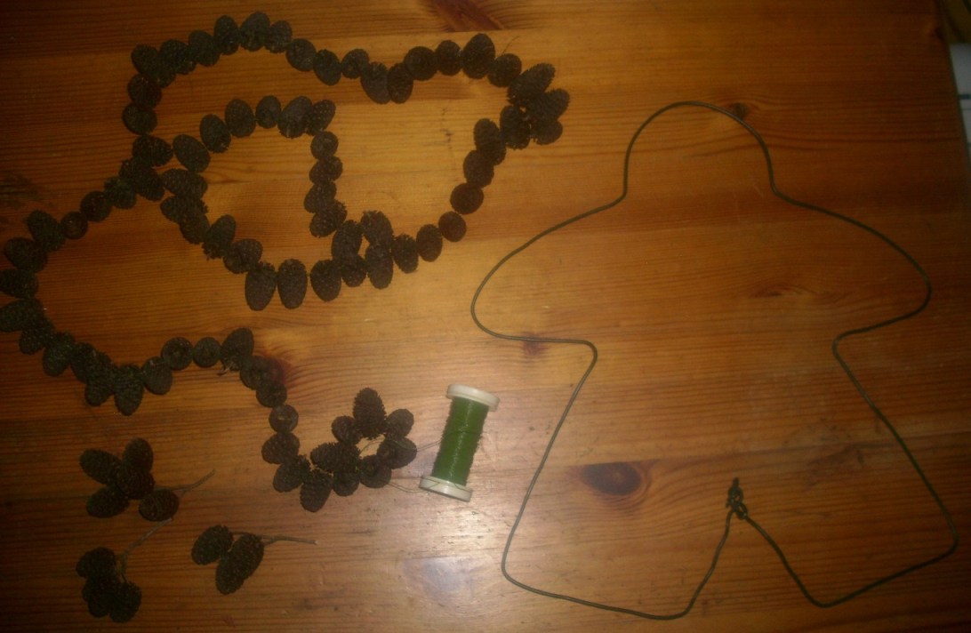 Dann habe ich verschiedene Sorten von Zapfen (Erle, Lärche und eine andere Sorte) mit dünnem Draht zu einer Kette verbunden.